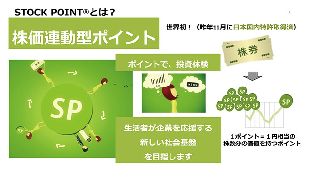 STOCK POINT(SP)は、企業の株価に連動して価値が上下するポイント。提供サービスは①運用型と②ロイヤリティ型のふたつ。①運用型サービスでは、持っているけど使い道のないポイントを自分が気になる企業のSPに変えて、その日からその企業の株式を持っているような運用体験を可能とし、②ロイヤリティ型サービスでは、企業の商品を買ったりサービスを使ったりすることで、その企業のSPを取得し、貯まったSPのポイント数が、1株相当以上のポイント数になると、その企業の現物株式との交換を可能とする。これが、「いつのまにか、株主」。